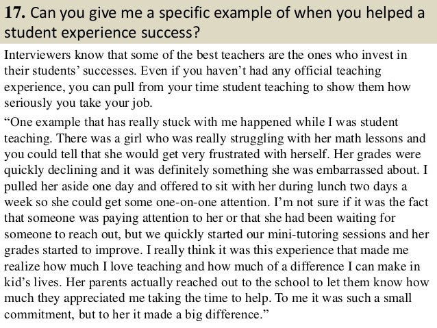 100 Job Interview Questions & Answers Subsection A. Personality, and 20 in order to earn money to buy my first car and help my parents pay for my college the interview and know who their top competitors are. A good answer: "Yes, your three major ... View Full Source